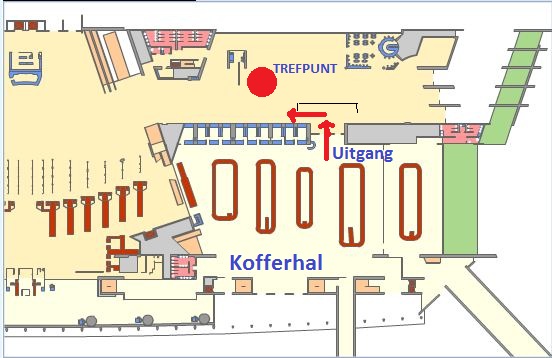 Wij wachten op je vóór de info desk, links van de uitgang kofferhal, zie de plattegrond hieronder van de luchthaven.